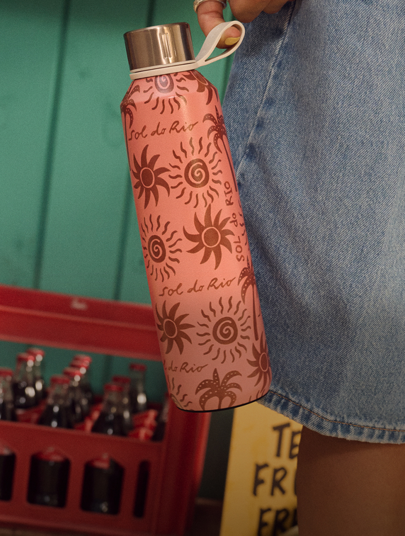 Person holding a striped tumbler with a straw, wearing yellow flip-flops.
