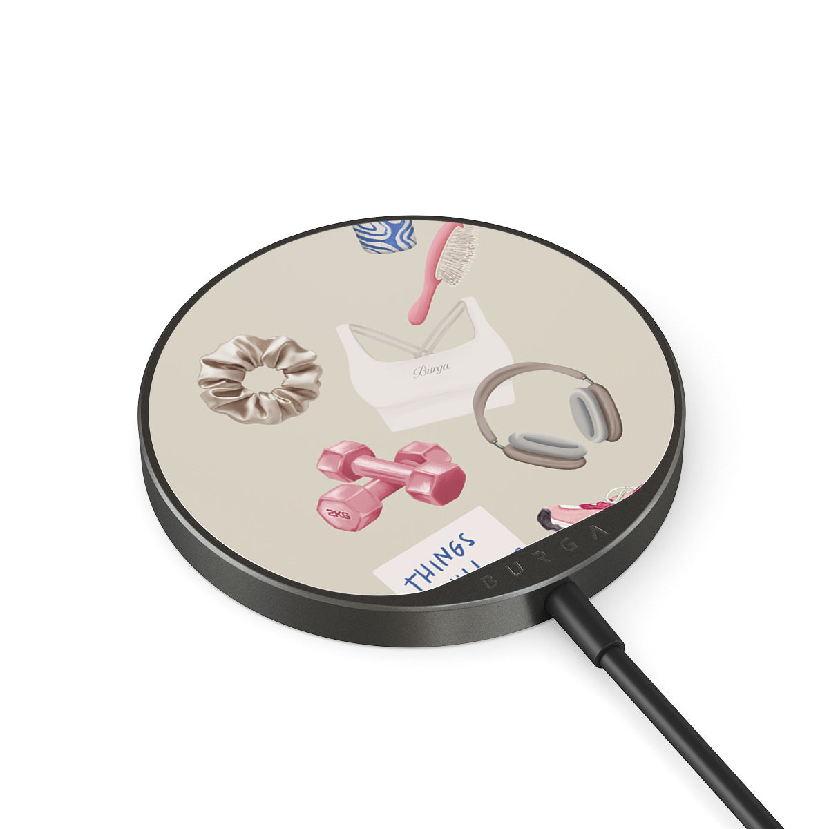 En este diseño: pesas, auriculares, termo, cepillo para el cabello, zapatillas rosas, sujetador deportivo, barrita Crunchie, nota adhesiva "Things Will Work Out"