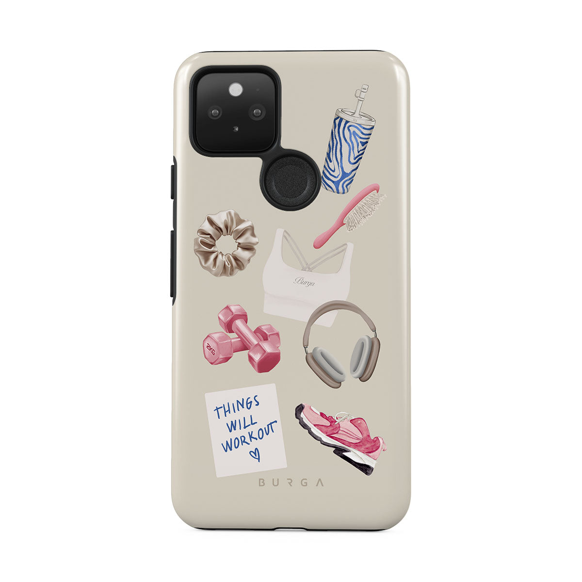 En este diseño: pesas, auriculares, termo, cepillo para el cabello, zapatillas rosas, sujetador deportivo, barrita Crunchie, nota adhesiva "Things Will Work Out".
