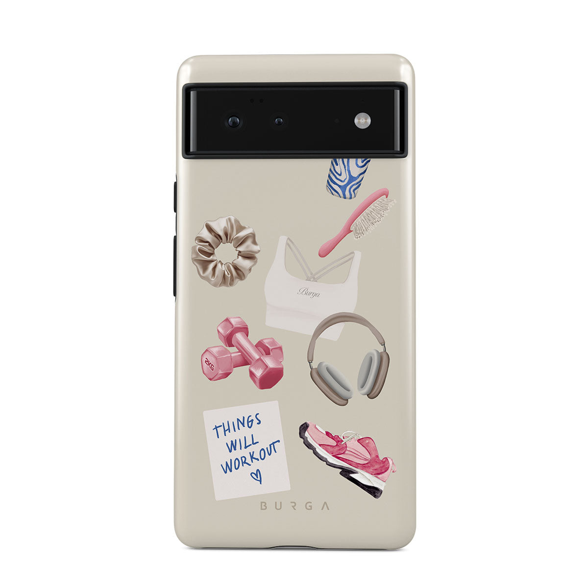 En este diseño: pesas, auriculares, termo, cepillo para el cabello, zapatillas rosas, sujetador deportivo, barrita Crunchie, nota adhesiva "Things Will Work Out".