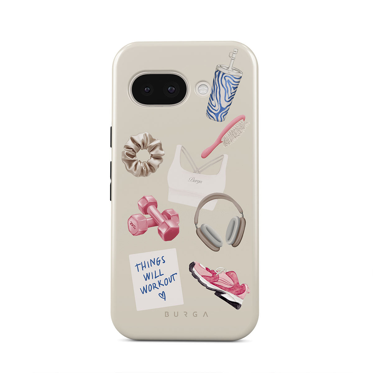 En este diseño: pesas, auriculares, termo, cepillo para el cabello, zapatillas rosas, sujetador deportivo, barrita Crunchie, nota adhesiva "Things Will Work Out".