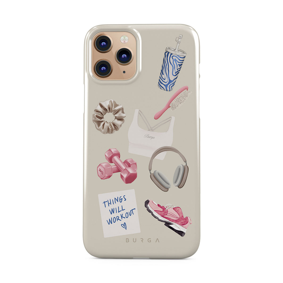 En este diseño: pesas, auriculares, termo, cepillo para el cabello, zapatillas rosas, sujetador deportivo, barrita Crunchie, nota adhesiva "Things Will Work Out".