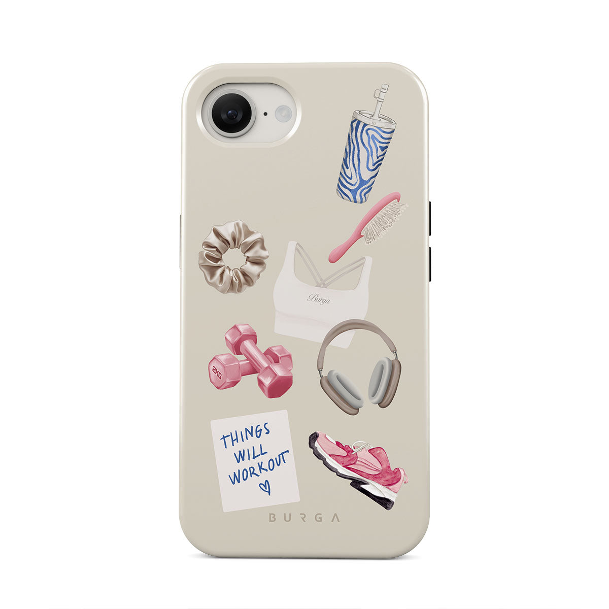 En este diseño: pesas, auriculares, termo, cepillo para el cabello, zapatillas rosas, sujetador deportivo, barrita Crunchie, nota adhesiva "Things Will Work Out".
