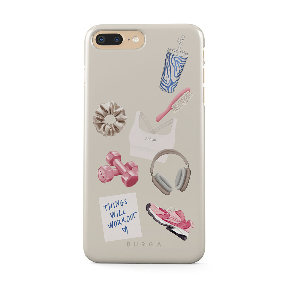 En este diseño: pesas, auriculares, termo, cepillo para el cabello, zapatillas rosas, sujetador deportivo, barrita Crunchie, nota adhesiva "Things Will Work Out".