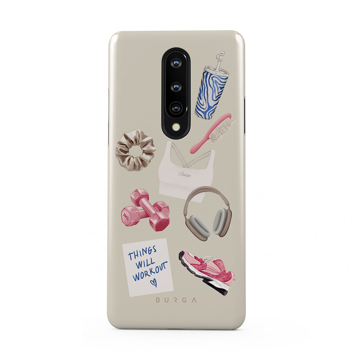 En este diseño: pesas, auriculares, termo, cepillo para el cabello, zapatillas rosas, sujetador deportivo, barrita Crunchie, nota adhesiva "Things Will Work Out".