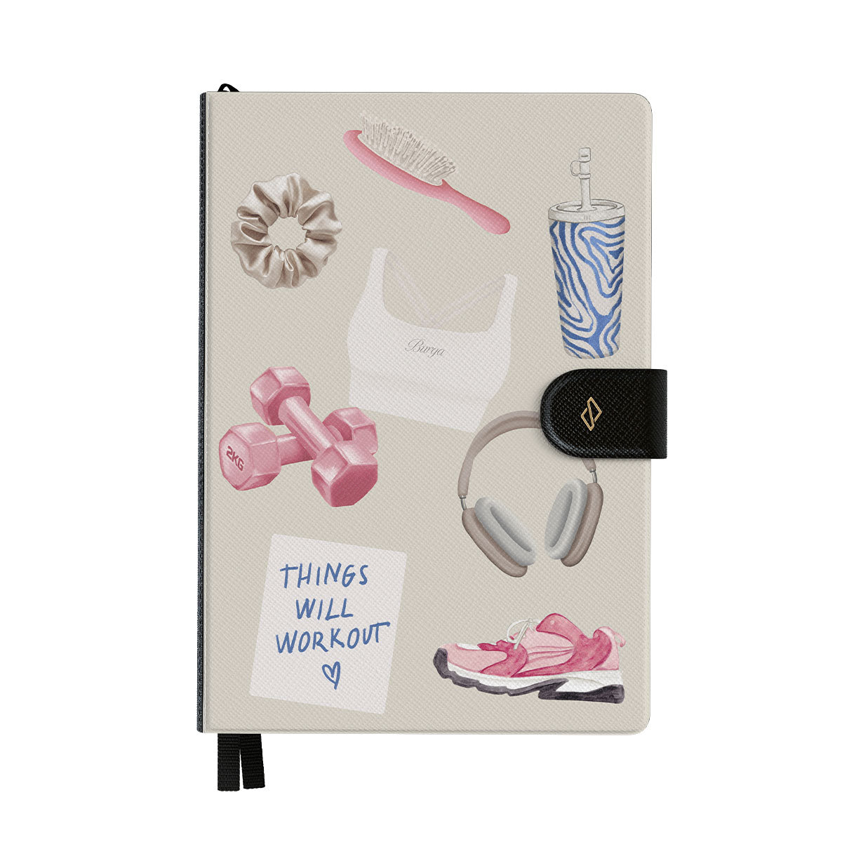 En este diseño: pesas, auriculares, termo, cepillo para el cabello, zapatillas rosas, sujetador deportivo, barrita Crunchie, nota adhesiva "Things Will Work Out".