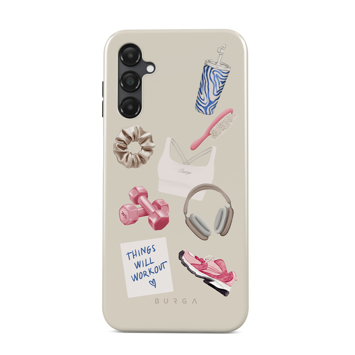 En este diseño: pesas, auriculares, termo, cepillo para el cabello, zapatillas rosas, sujetador deportivo, barrita Crunchie, nota adhesiva "Things Will Work Out".