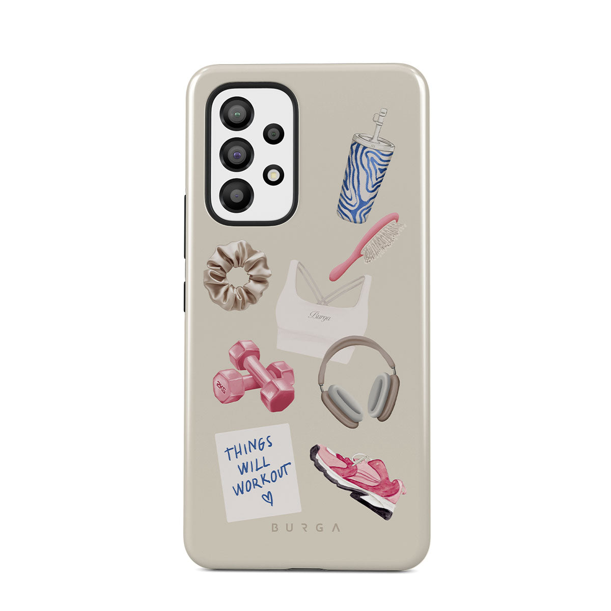 En este diseño: pesas, auriculares, termo, cepillo para el cabello, zapatillas rosas, sujetador deportivo, barrita Crunchie, nota adhesiva "Things Will Work Out".