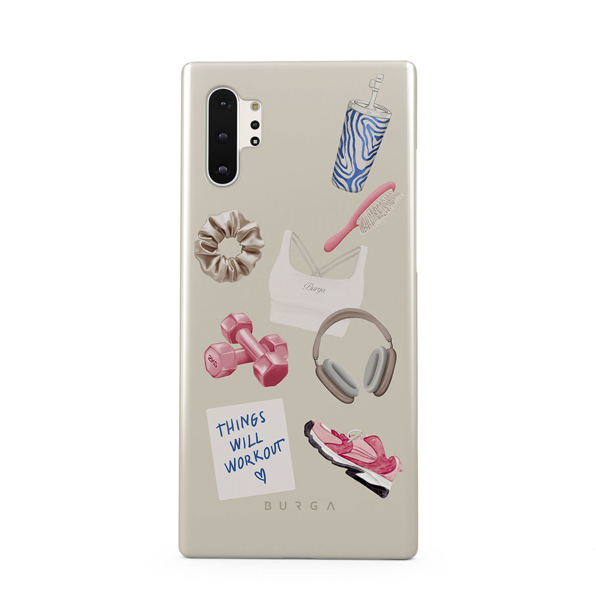En este diseño: pesas, auriculares, termo, cepillo para el cabello, zapatillas rosas, sujetador deportivo, barrita Crunchie, nota adhesiva "Things Will Work Out".