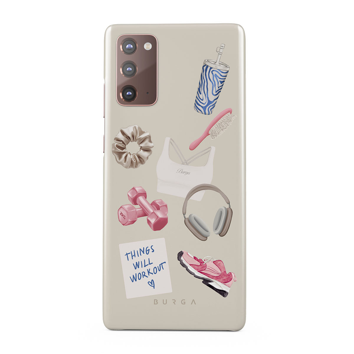 En este diseño: pesas, auriculares, termo, cepillo para el cabello, zapatillas rosas, sujetador deportivo, barrita Crunchie, nota adhesiva "Things Will Work Out".