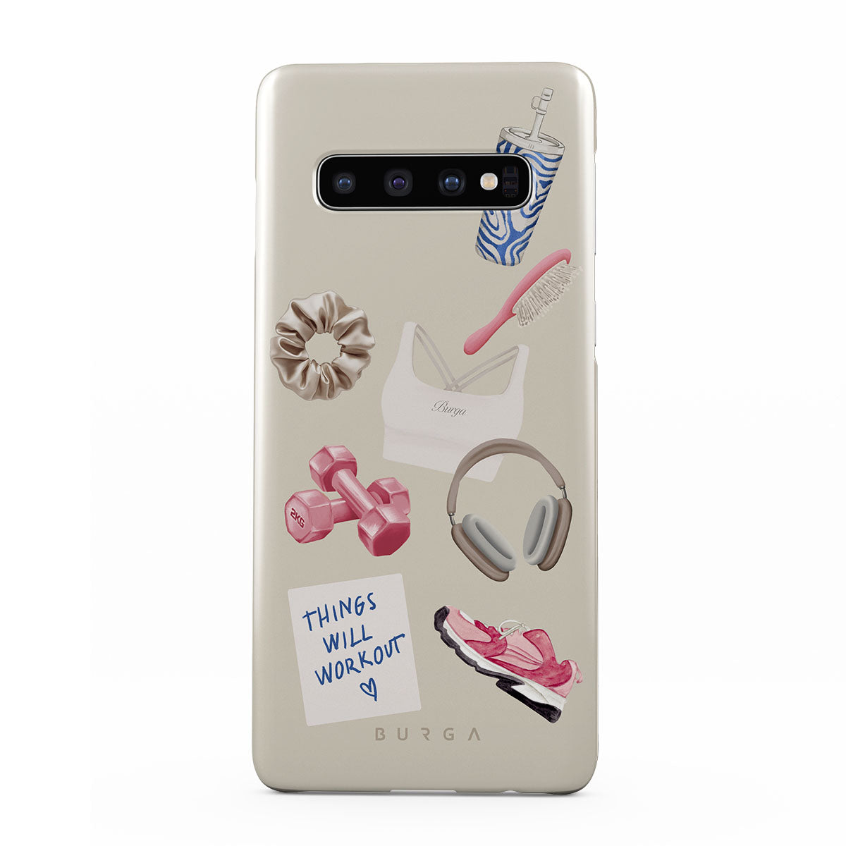 En este diseño: pesas, auriculares, termo, cepillo para el cabello, zapatillas rosas, sujetador deportivo, barrita Crunchie, nota adhesiva "Things Will Work Out".