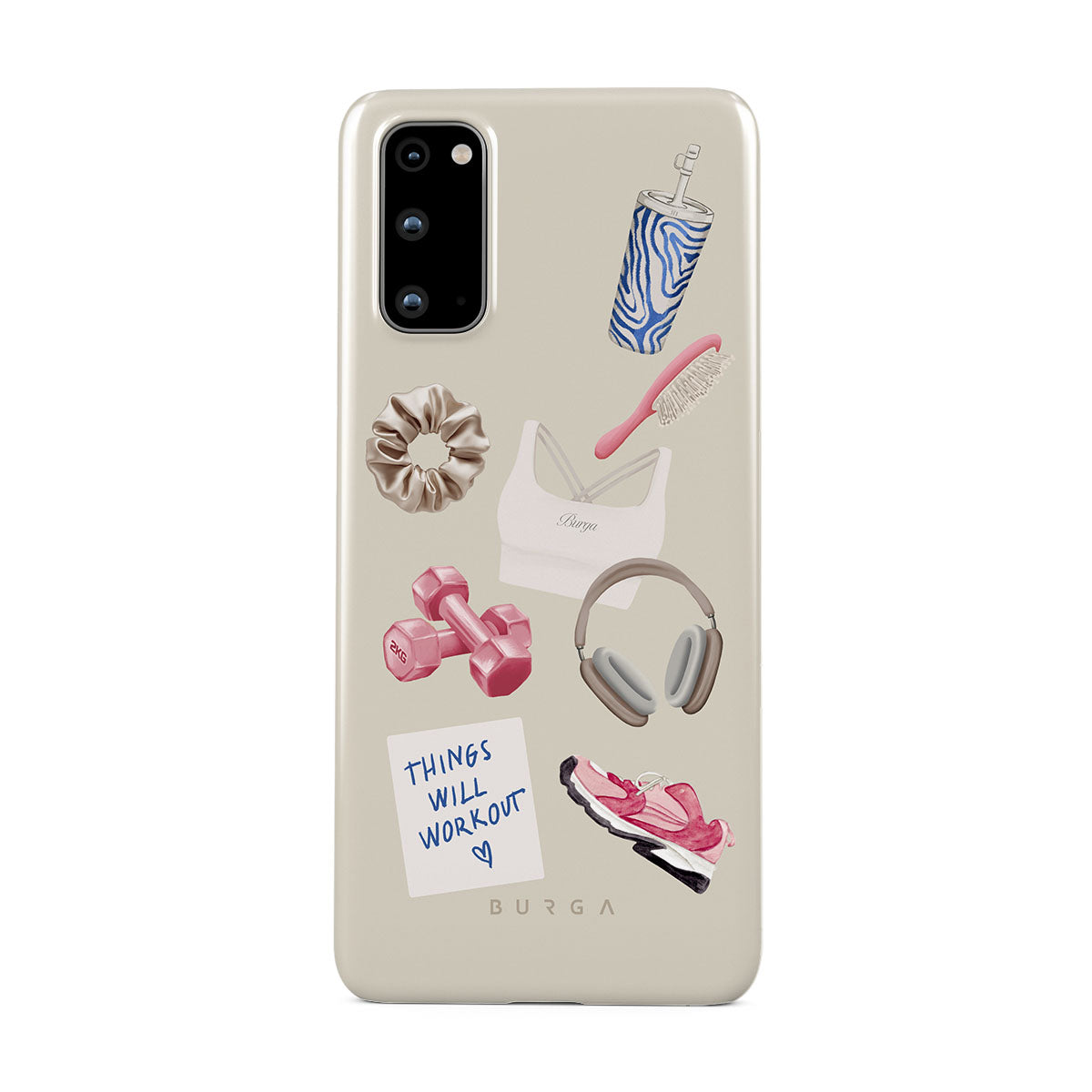 En este diseño: pesas, auriculares, termo, cepillo para el cabello, zapatillas rosas, sujetador deportivo, barrita Crunchie, nota adhesiva "Things Will Work Out".