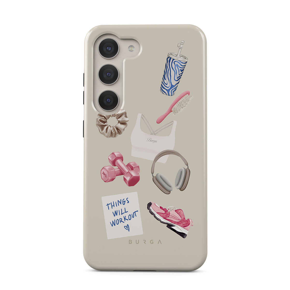 En este diseño: pesas, auriculares, termo, cepillo para el cabello, zapatillas rosas, sujetador deportivo, barrita Crunchie, nota adhesiva "Things Will Work Out".