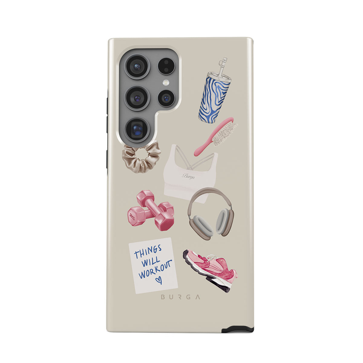 En este diseño: pesas, auriculares, termo, cepillo para el cabello, zapatillas rosas, sujetador deportivo, barrita Crunchie, nota adhesiva "Things Will Work Out".
