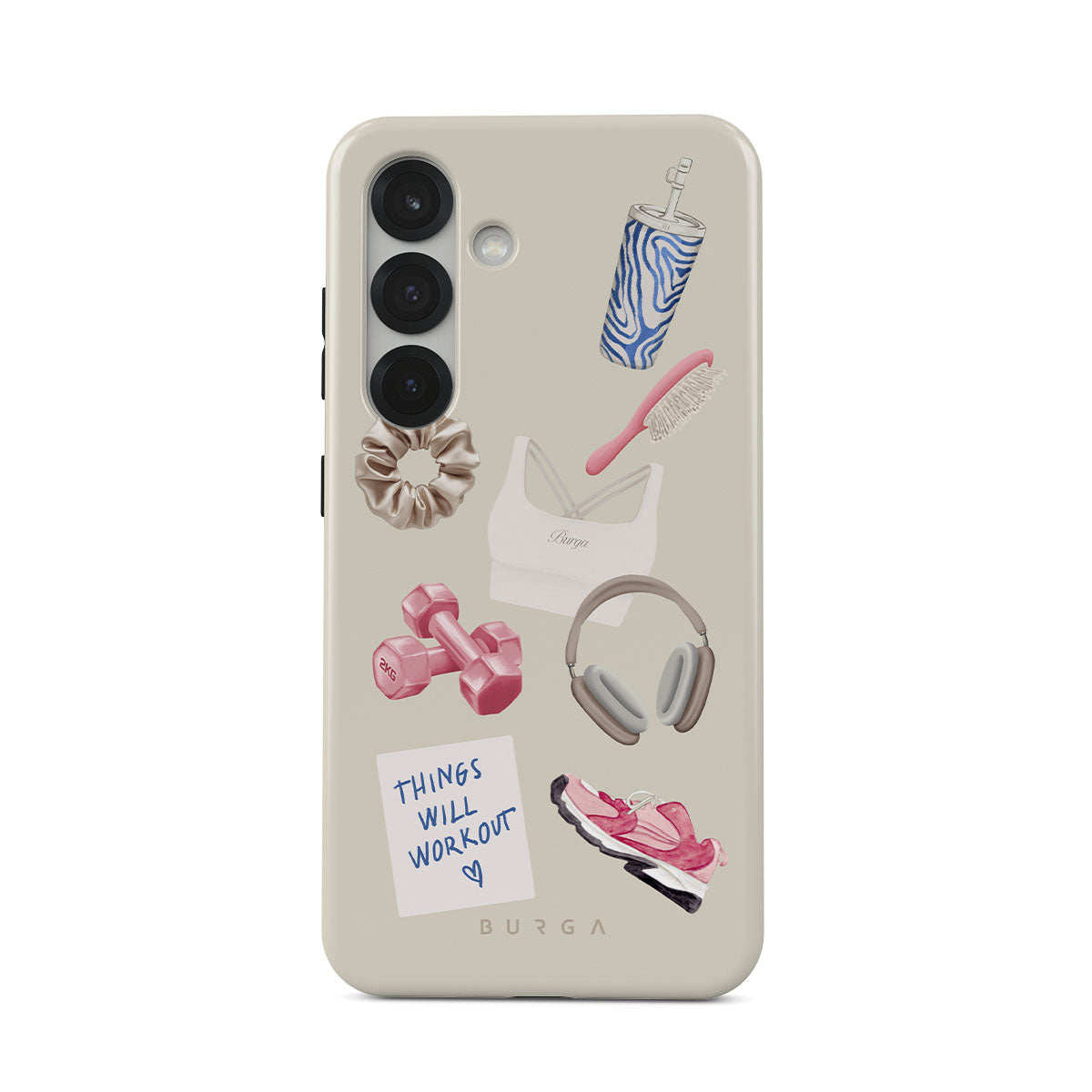 En este diseño: pesas, auriculares, termo, cepillo para el cabello, zapatillas rosas, sujetador deportivo, barrita Crunchie, nota adhesiva "Things Will Work Out".