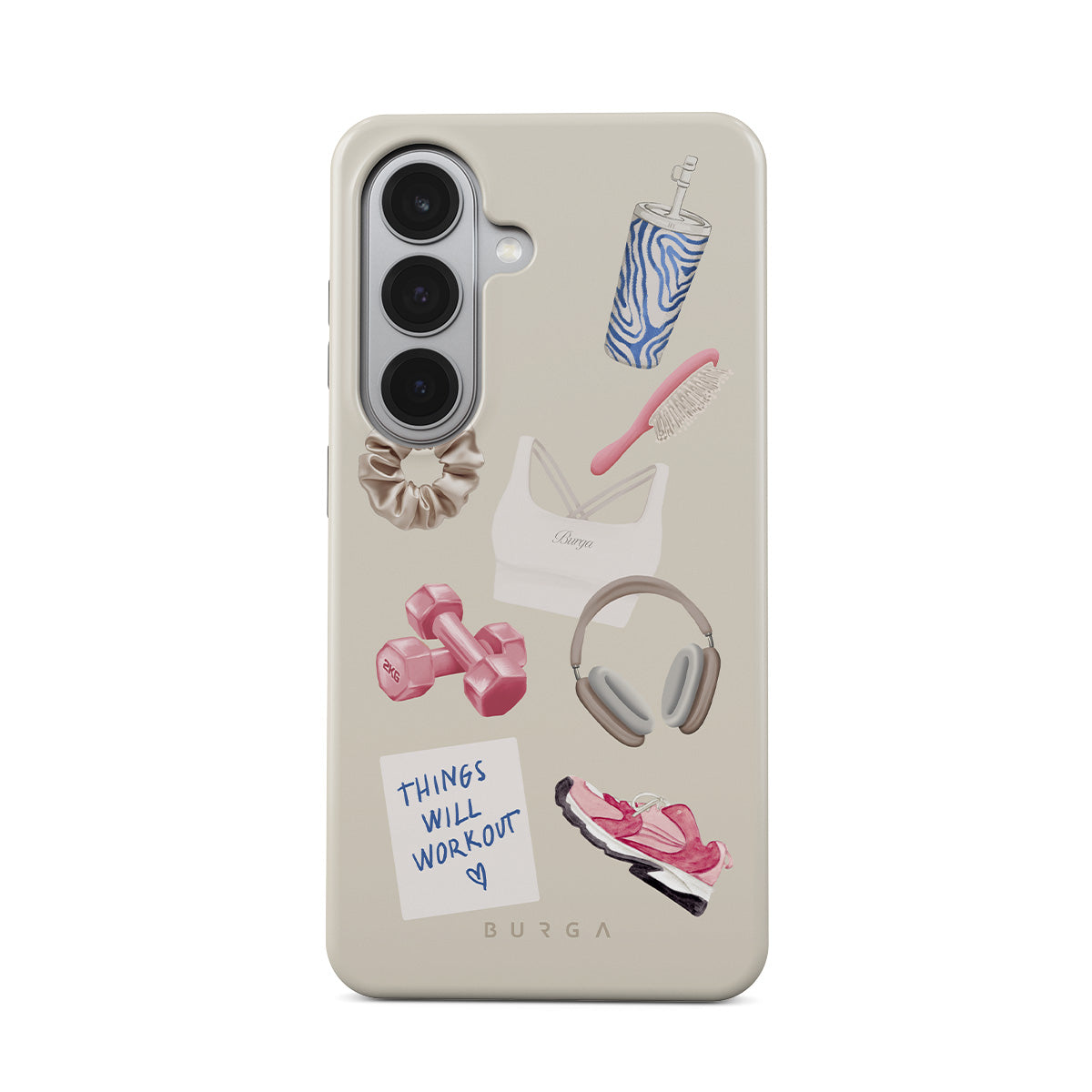 En este diseño: pesas, auriculares, termo, cepillo para el cabello, zapatillas rosas, sujetador deportivo, barrita Crunchie, nota adhesiva "Things Will Work Out".