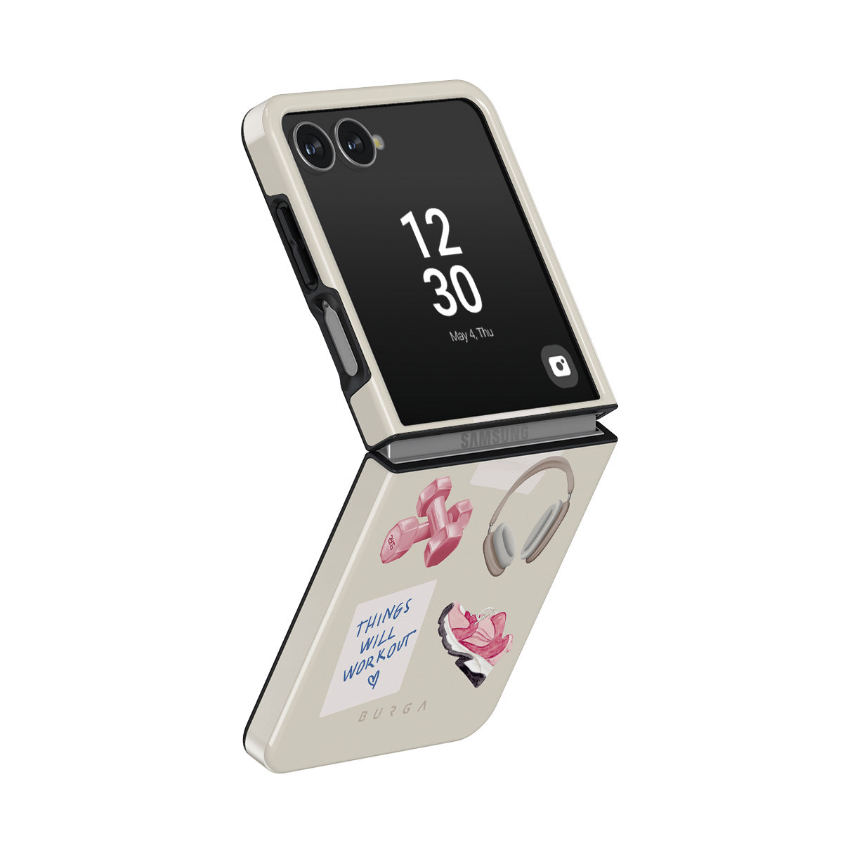 En este diseño: pesas, auriculares, termo, cepillo para el cabello, zapatillas rosas, sujetador deportivo, barrita Crunchie, nota adhesiva "Things Will Work Out".