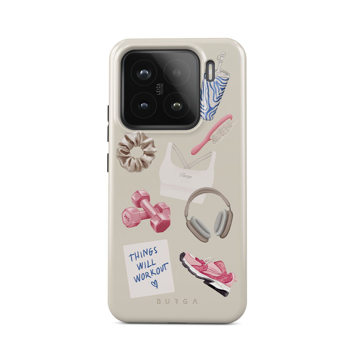 En este diseño: pesas, auriculares, termo, cepillo para el cabello, zapatillas rosas, sujetador deportivo, barrita Crunchie, nota adhesiva "Things Will Work Out".