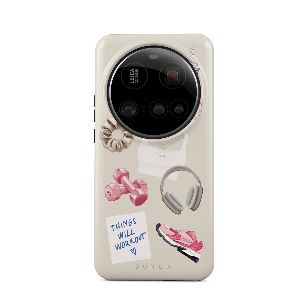 En este diseño: pesas, auriculares, termo, cepillo para el cabello, zapatillas rosas, sujetador deportivo, barrita Crunchie, nota adhesiva "Things Will Work Out".