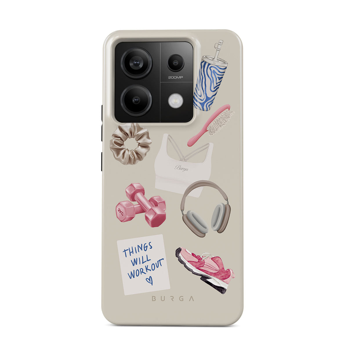 En este diseño: pesas, auriculares, termo, cepillo para el cabello, zapatillas rosas, sujetador deportivo, barrita Crunchie, nota adhesiva "Things Will Work Out".