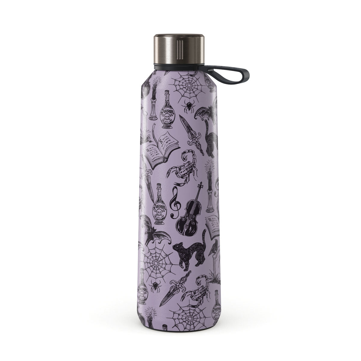 En este diseño: garabatos góticos, elementos místicos, arañas, telaraña, gato, violín, ojo, vela, daga, libro, murciélago, cuervo, escorpión