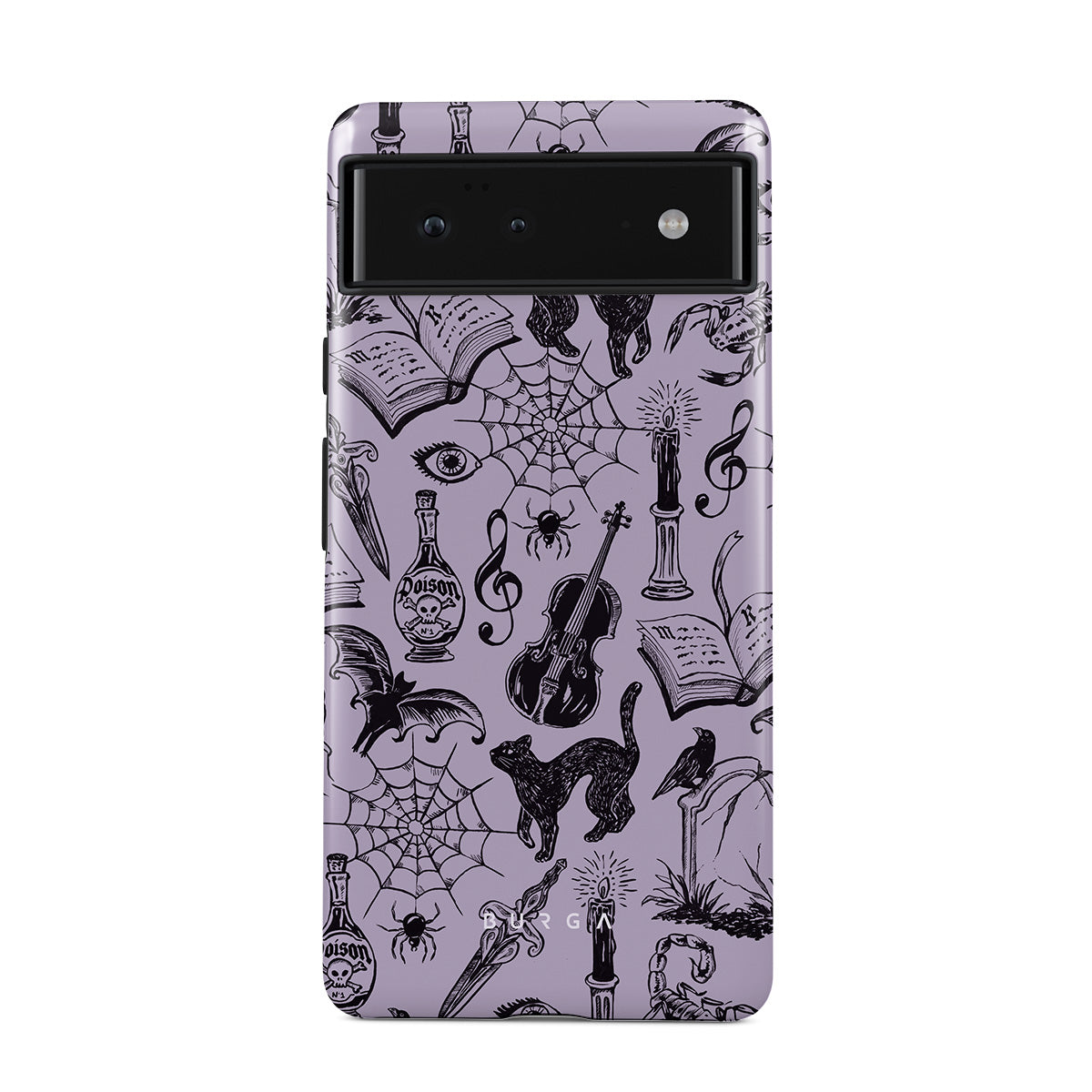 En este diseño: garabatos góticos, elementos místicos, arañas, telaraña, gato, violín, ojo, vela, daga, libro, murciélago, cuervo, escorpión