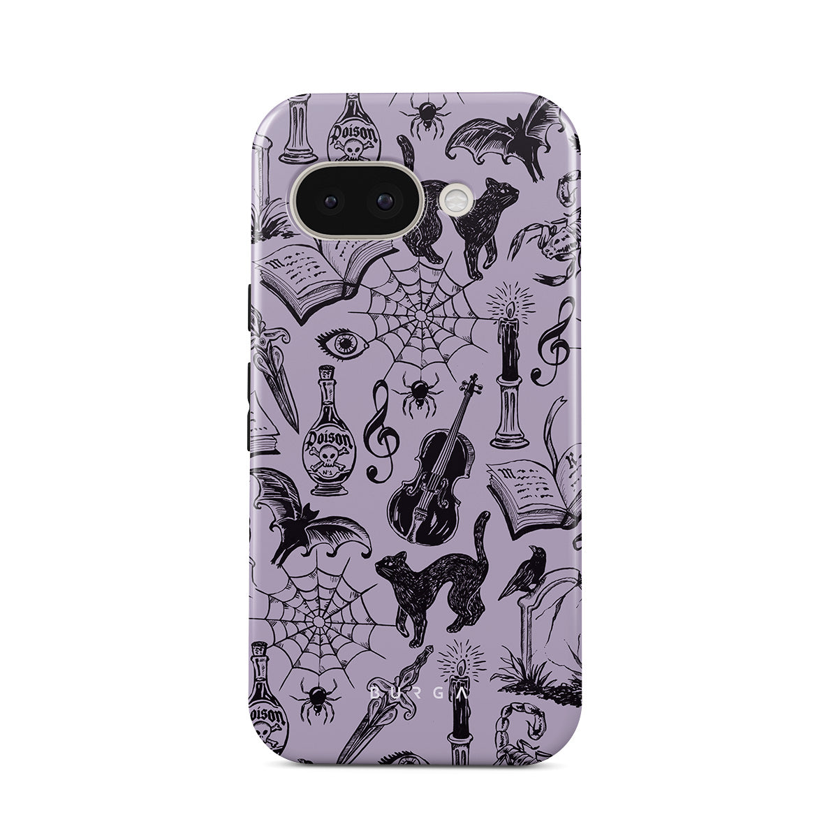 En este diseño: garabatos góticos, elementos místicos, arañas, telaraña, gato, violín, ojo, vela, daga, libro, murciélago, cuervo, escorpión