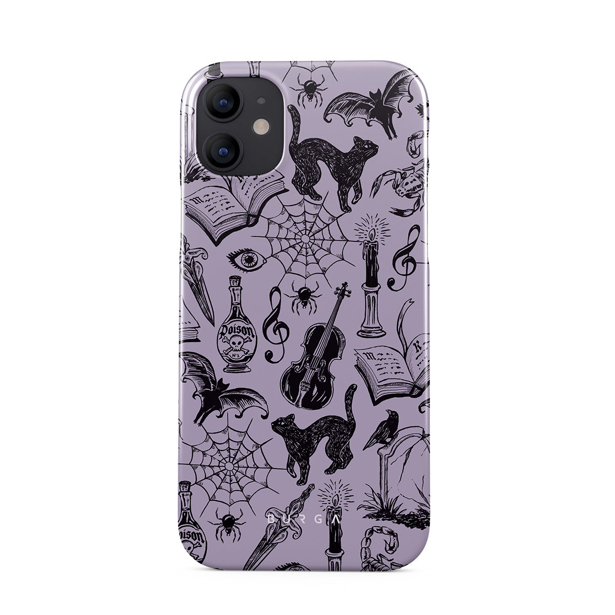 En este diseño: garabatos góticos, elementos místicos, arañas, telaraña, gato, violín, ojo, vela, daga, libro, murciélago, cuervo, escorpión
