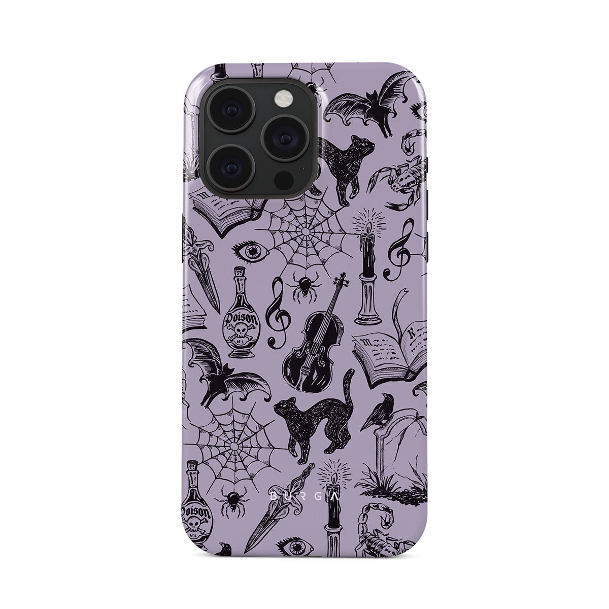 En este diseño: garabatos góticos, elementos místicos, arañas, telaraña, gato, violín, ojo, vela, daga, libro, murciélago, cuervo, escorpión