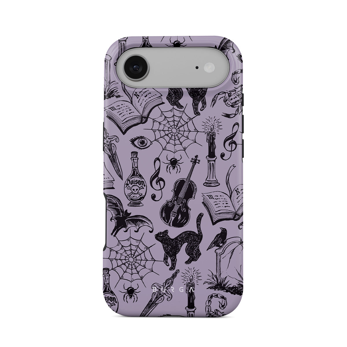 En este diseño: garabatos góticos, elementos místicos, arañas, telaraña, gato, violín, ojo, vela, daga, libro, murciélago, cuervo, escorpión