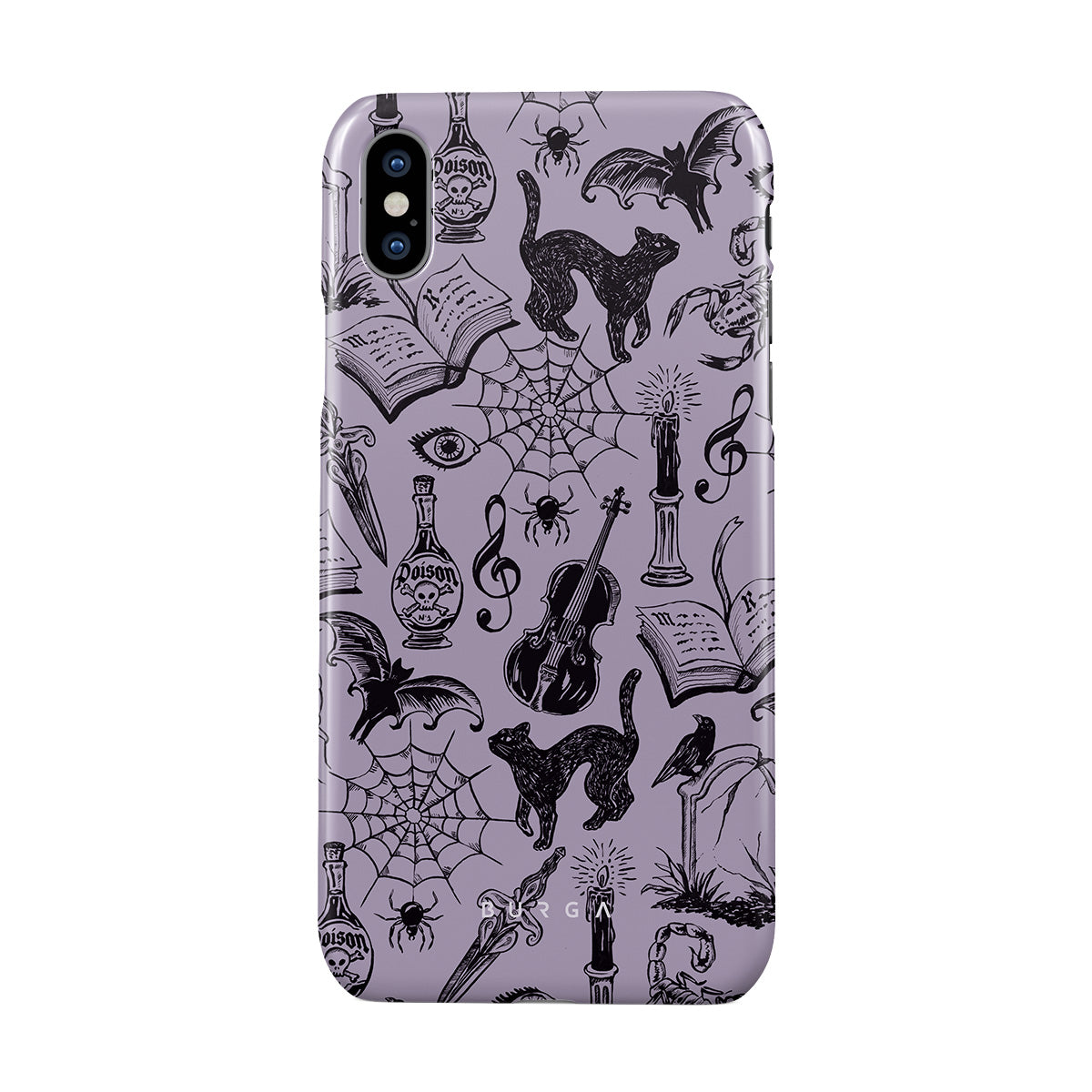 En este diseño: garabatos góticos, elementos místicos, arañas, telaraña, gato, violín, ojo, vela, daga, libro, murciélago, cuervo, escorpión