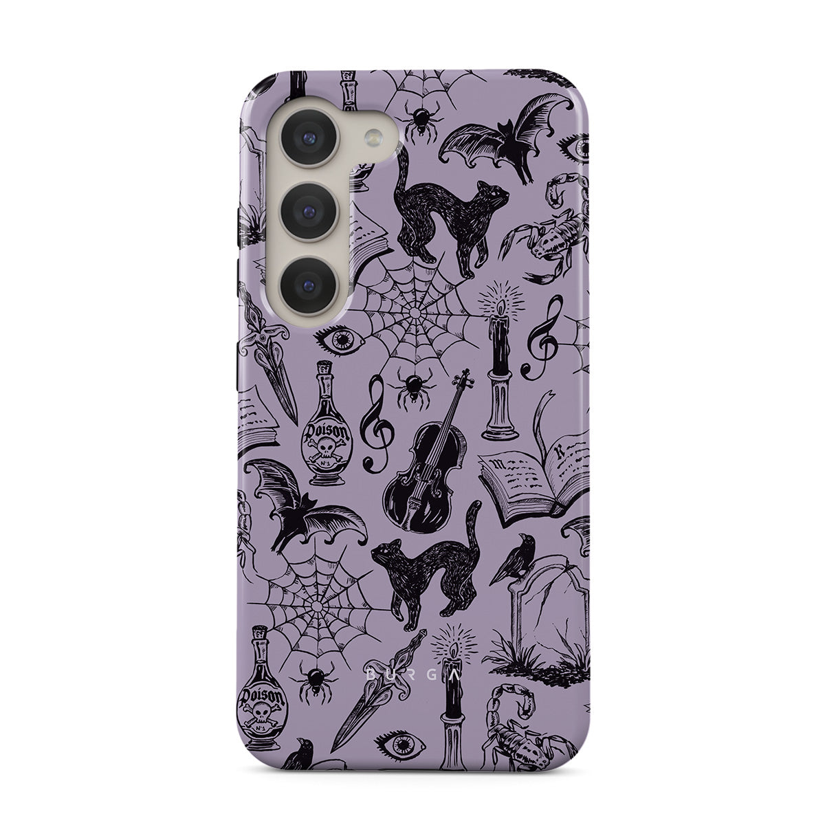En este diseño: garabatos góticos, elementos místicos, arañas, telaraña, gato, violín, ojo, vela, daga, libro, murciélago, cuervo, escorpión