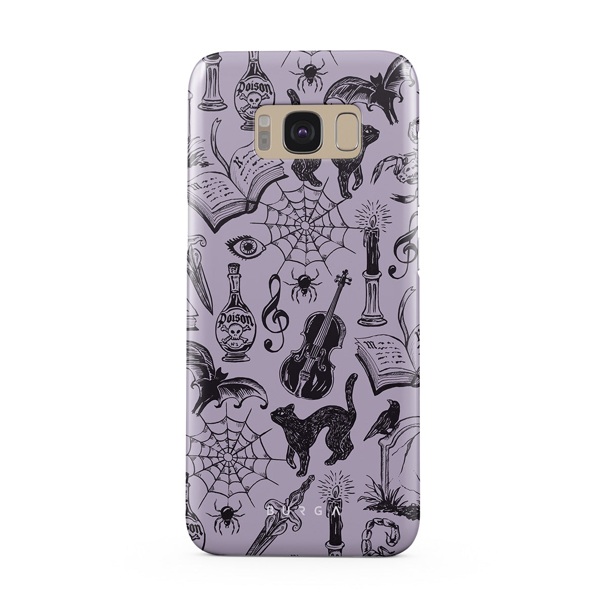 En este diseño: garabatos góticos, elementos místicos, arañas, telaraña, gato, violín, ojo, vela, daga, libro, murciélago, cuervo, escorpión