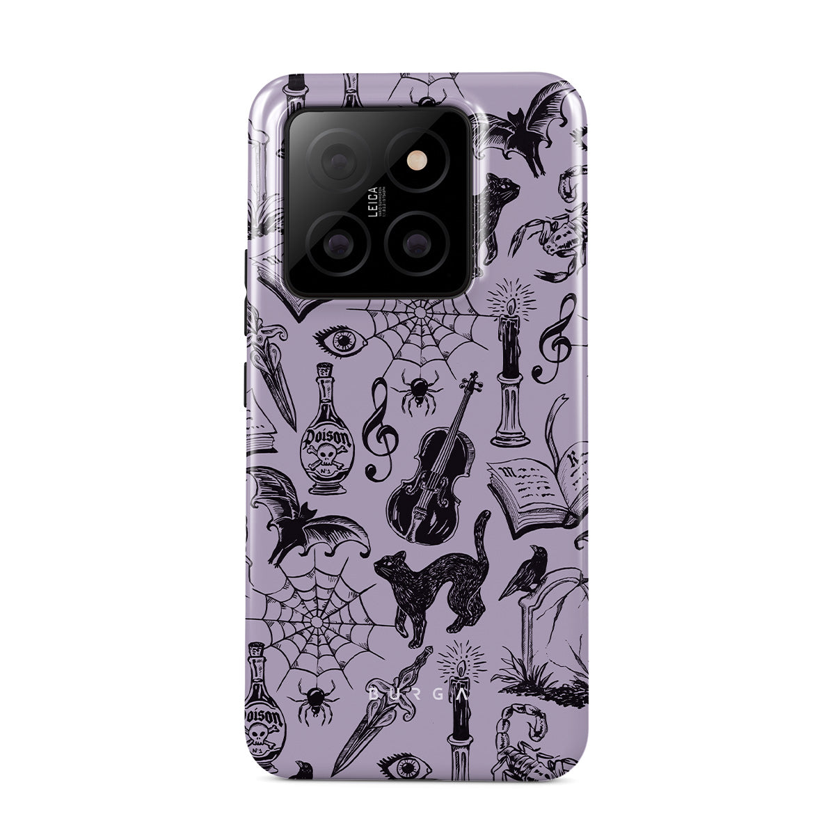 En este diseño: garabatos góticos, elementos místicos, arañas, telaraña, gato, violín, ojo, vela, daga, libro, murciélago, cuervo, escorpión