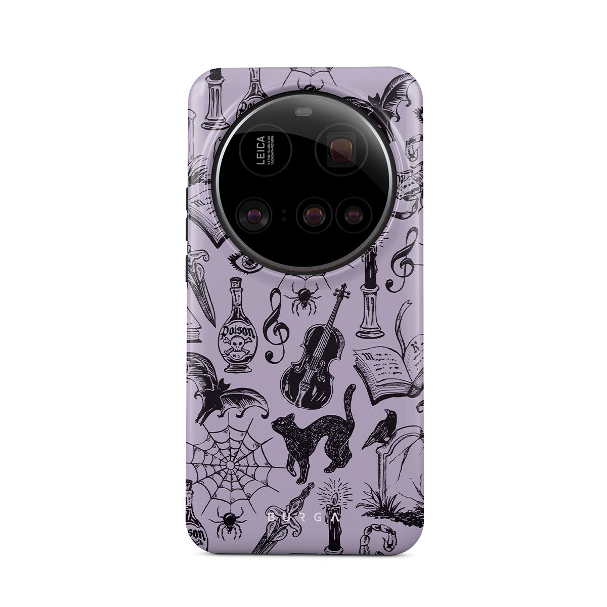 En este diseño: garabatos góticos, elementos místicos, arañas, telaraña, gato, violín, ojo, vela, daga, libro, murciélago, cuervo, escorpión