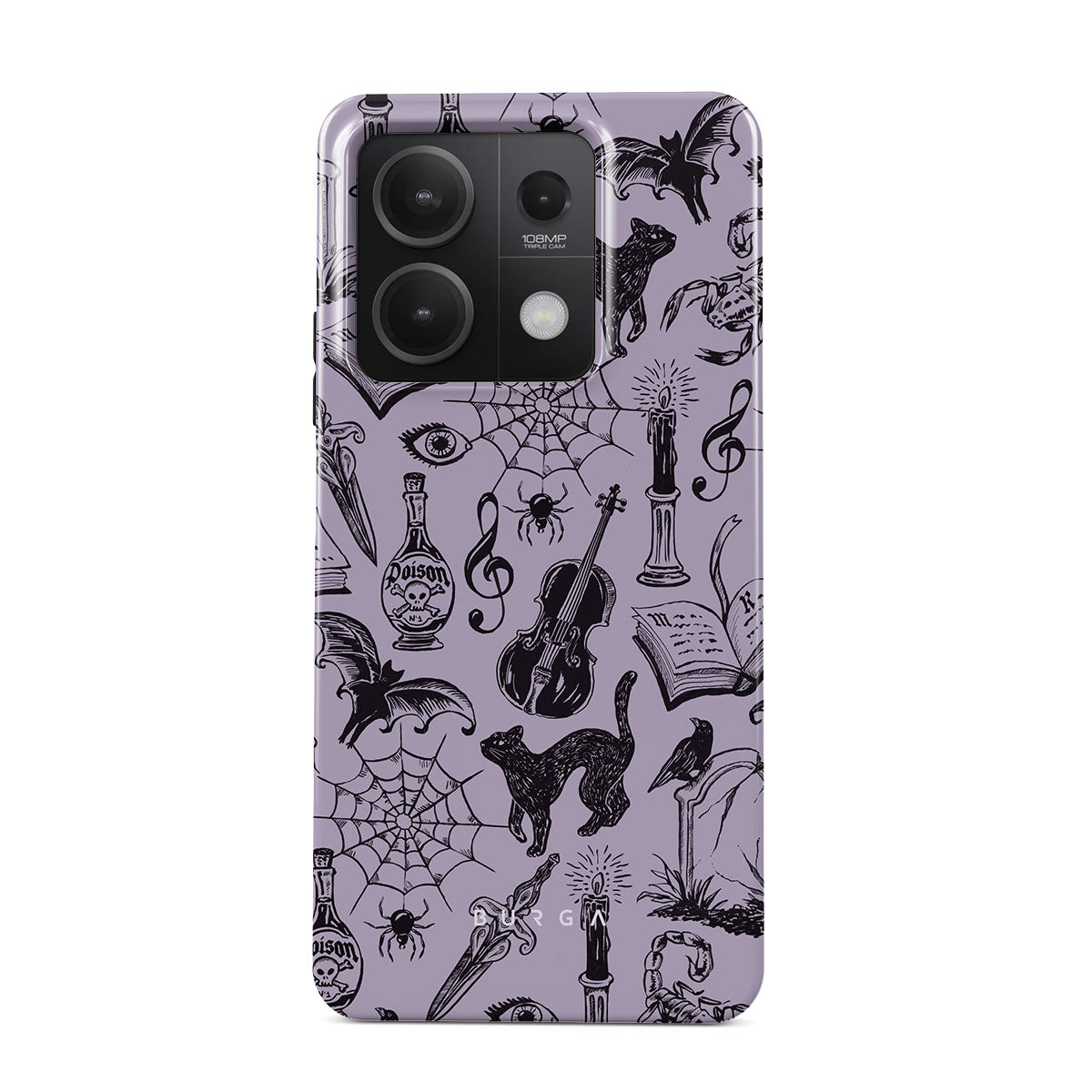 En este diseño: garabatos góticos, elementos místicos, arañas, telaraña, gato, violín, ojo, vela, daga, libro, murciélago, cuervo, escorpión