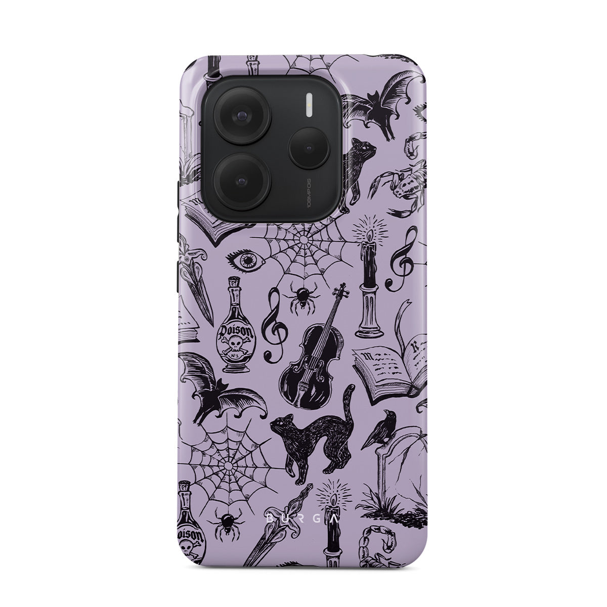 En este diseño: garabatos góticos, elementos místicos, arañas, telaraña, gato, violín, ojo, vela, daga, libro, murciélago, cuervo, escorpión