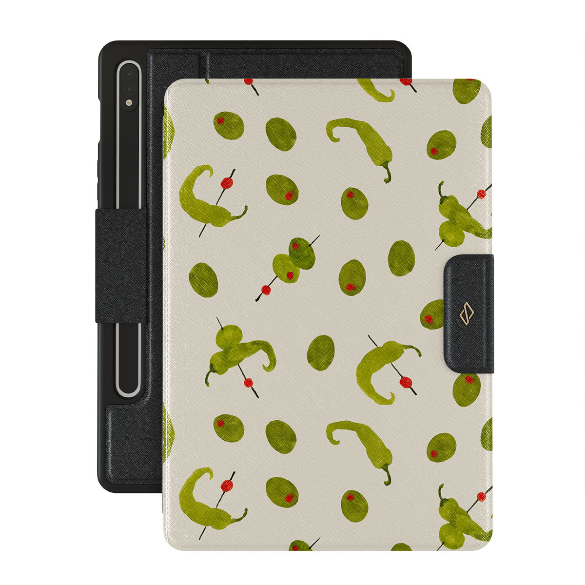 En este diseño: aceitunas, pimientos, patrones mediterráneos.