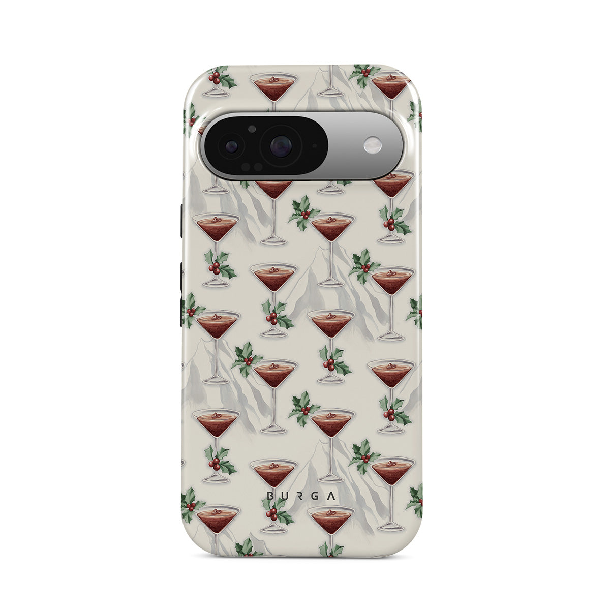 En este diseño: copas de cóctel, martinis, hojas de acebo