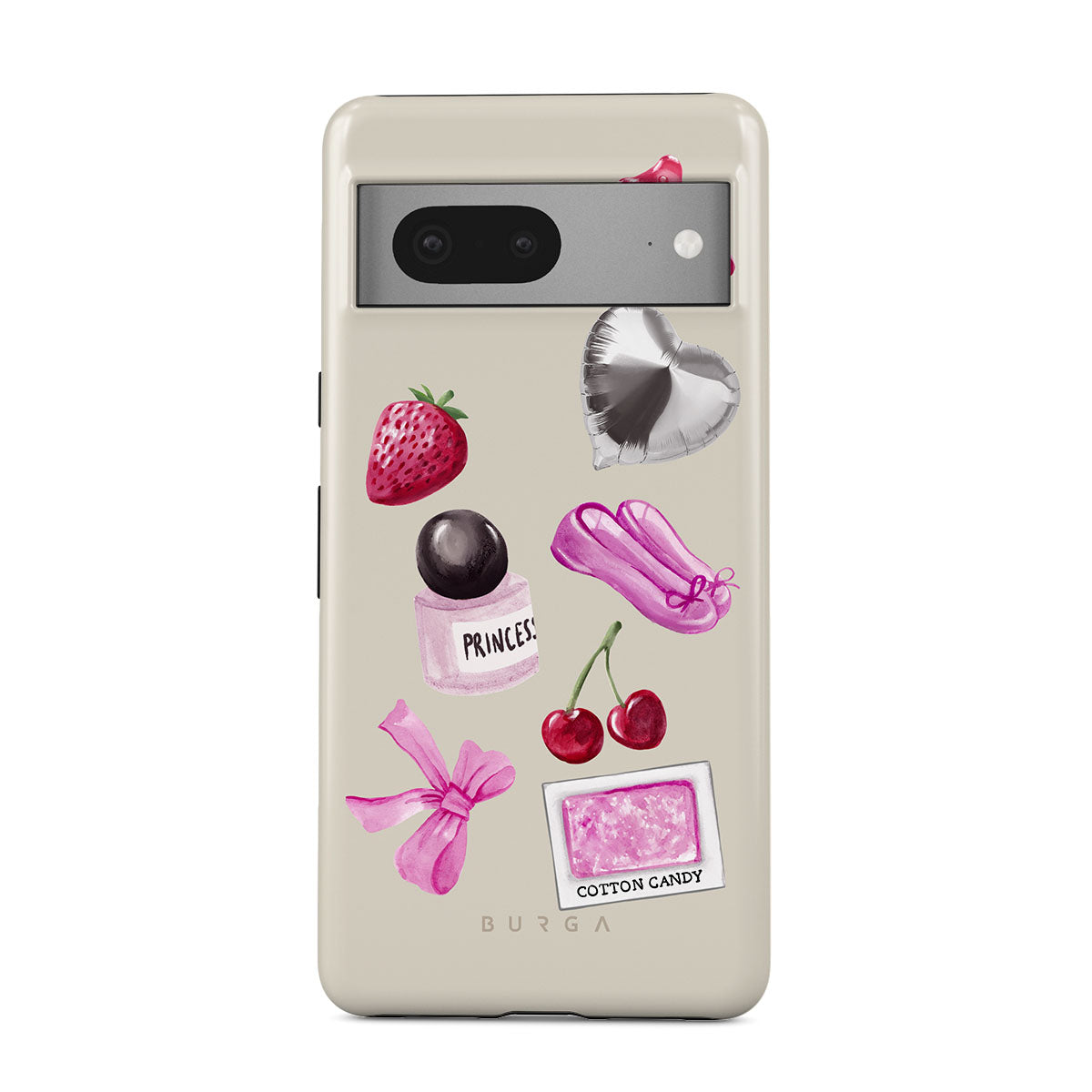 En este diseño: lazo rosa, globo plateado en forma de corazón, frasco de perfume, fresa, cerezas, zapatillas de ballet rosas, sticker de algodón de azúcar, osito de goma rosa.