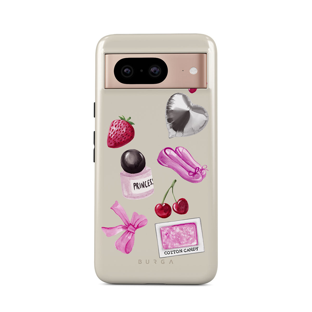 En este diseño: lazo rosa, globo plateado en forma de corazón, frasco de perfume, fresa, cerezas, zapatillas de ballet rosas, sticker de algodón de azúcar, osito de goma rosa.
