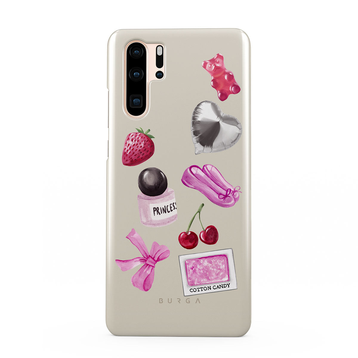 En este diseño: lazo rosa, globo plateado en forma de corazón, frasco de perfume, fresa, cerezas, zapatillas de ballet rosas, sticker de algodón de azúcar, osito de goma rosa.