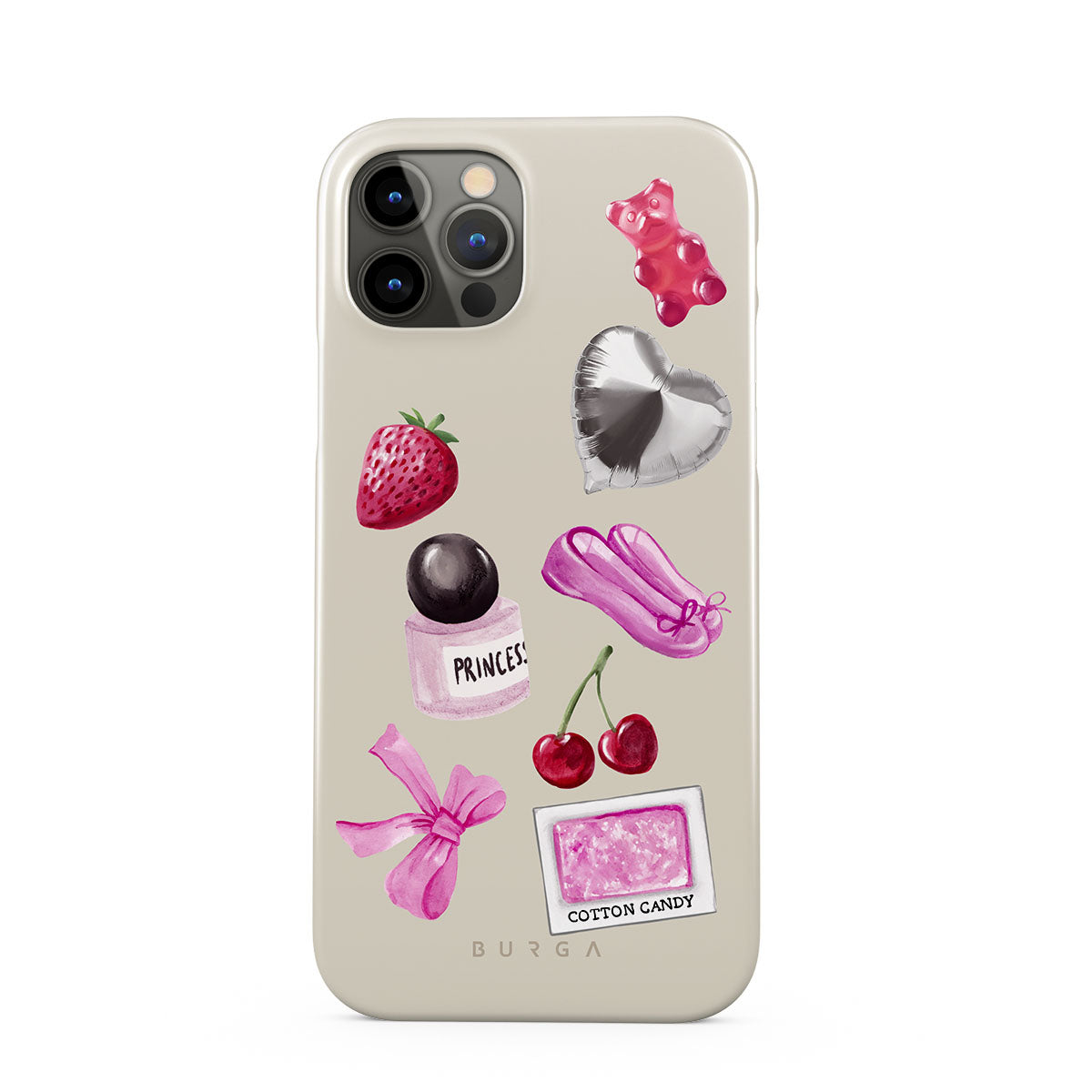 En este diseño: lazo rosa, globo plateado en forma de corazón, frasco de perfume, fresa, cerezas, zapatillas de ballet rosas, sticker de algodón de azúcar, osito de goma rosa.