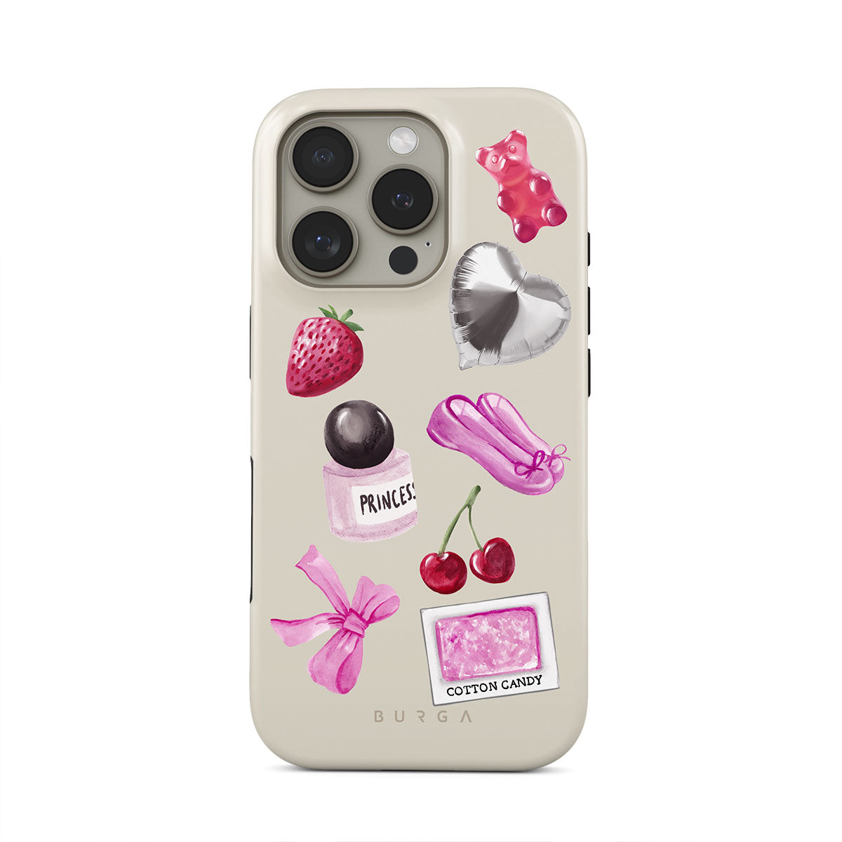En este diseño: lazo rosa, globo plateado en forma de corazón, frasco de perfume, fresa, cerezas, zapatillas de ballet rosas, sticker de algodón de azúcar, osito de goma rosa.