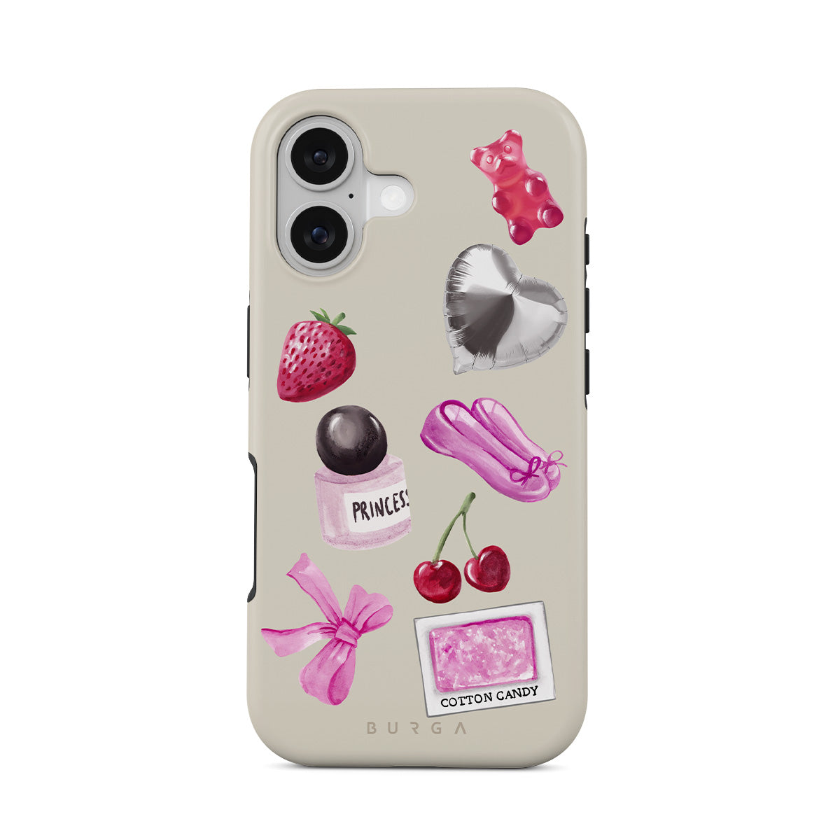 En este diseño: lazo rosa, globo plateado en forma de corazón, frasco de perfume, fresa, cerezas, zapatillas de ballet rosas, sticker de algodón de azúcar, osito de goma rosa.