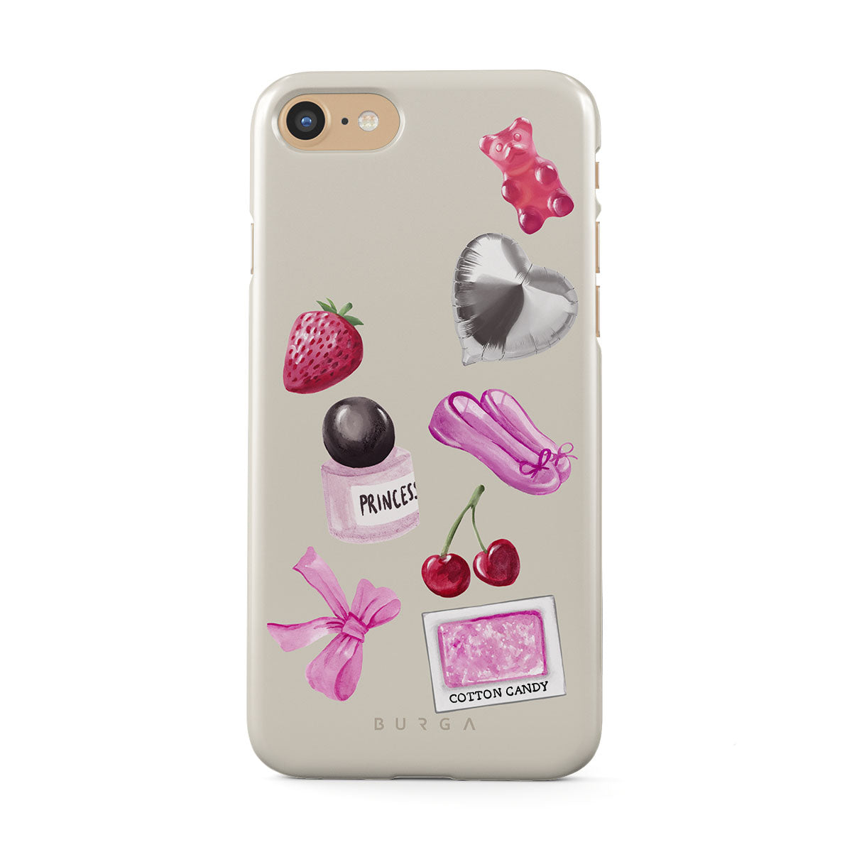 En este diseño: lazo rosa, globo plateado en forma de corazón, frasco de perfume, fresa, cerezas, zapatillas de ballet rosas, sticker de algodón de azúcar, osito de goma rosa.