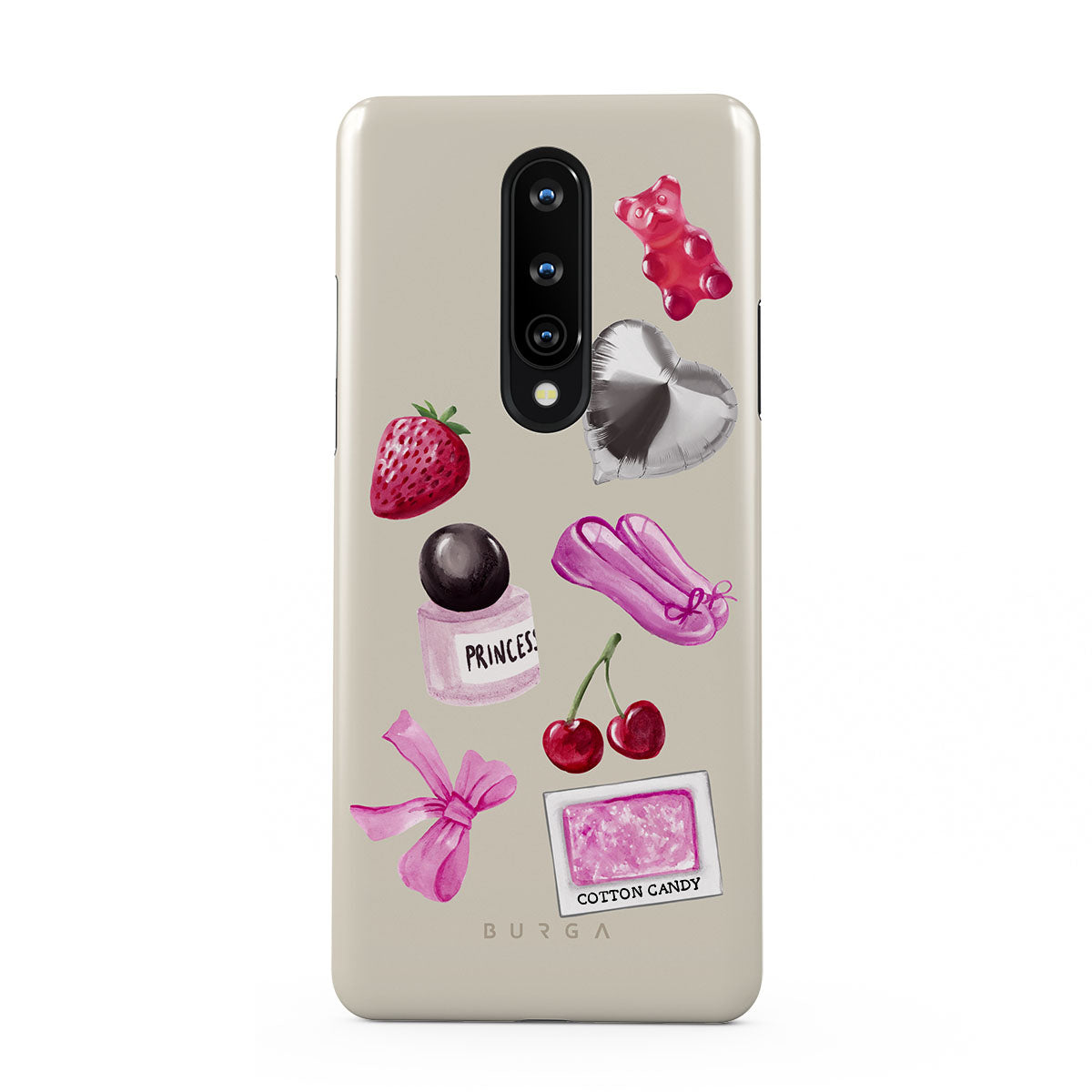 En este diseño: lazo rosa, globo plateado en forma de corazón, frasco de perfume, fresa, cerezas, zapatillas de ballet rosas, sticker de algodón de azúcar, osito de goma rosa.