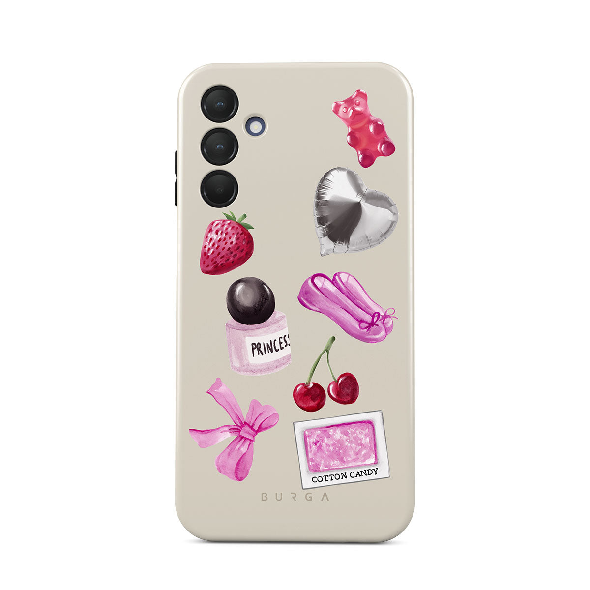 En este diseño: lazo rosa, globo plateado en forma de corazón, frasco de perfume, fresa, cerezas, zapatillas de ballet rosas, sticker de algodón de azúcar, osito de goma rosa.