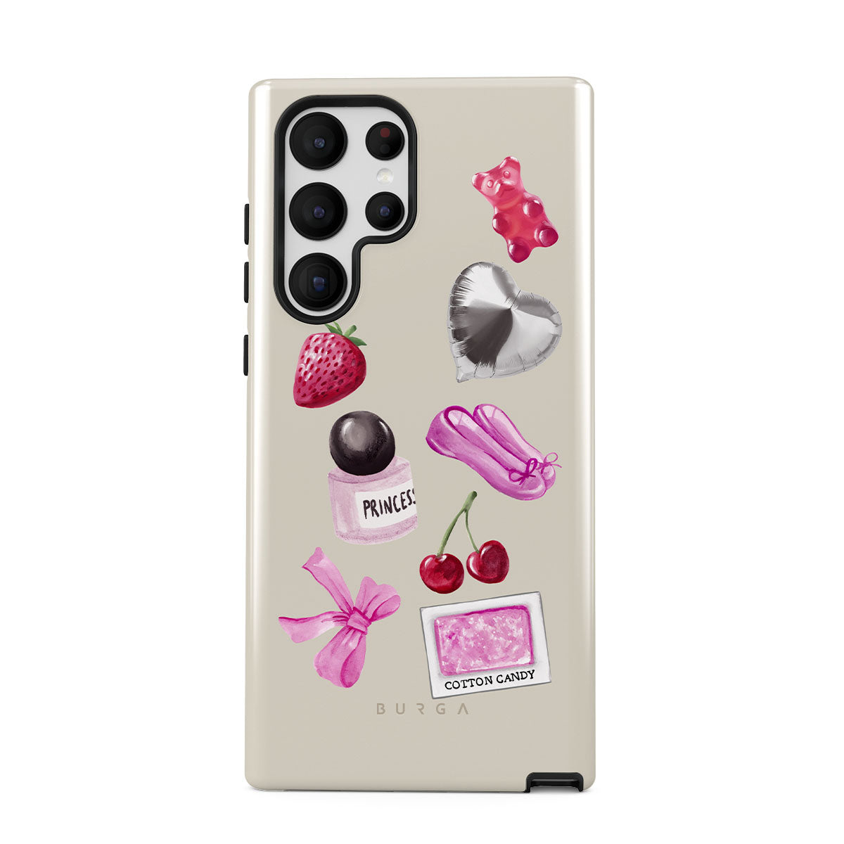 En este diseño: lazo rosa, globo plateado en forma de corazón, frasco de perfume, fresa, cerezas, zapatillas de ballet rosas, sticker de algodón de azúcar, osito de goma rosa.