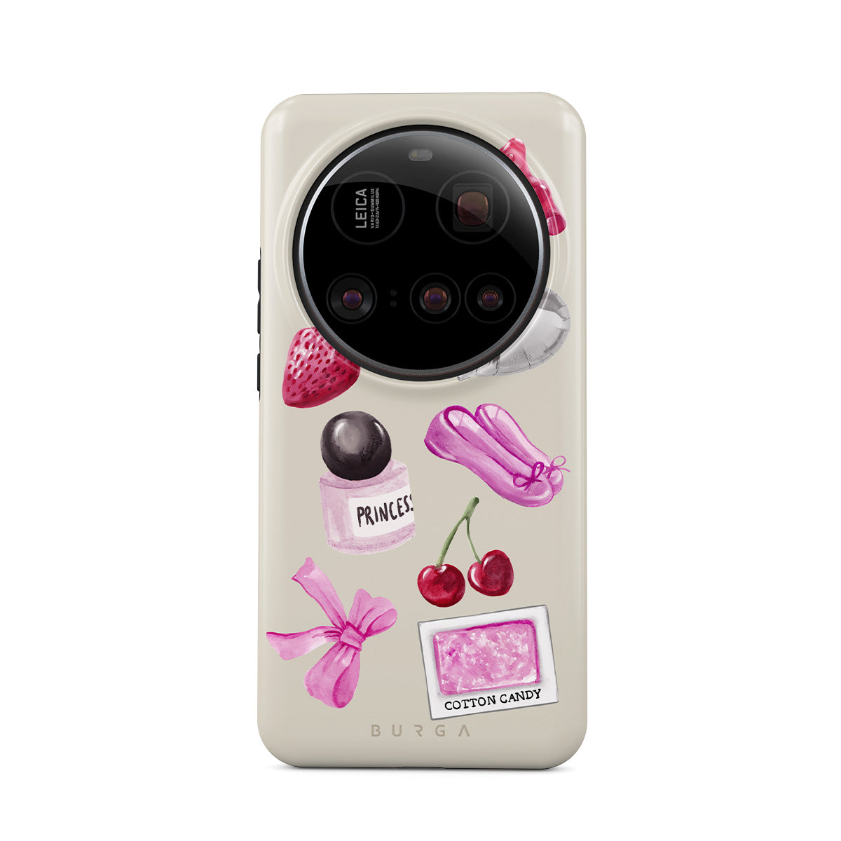En este diseño: lazo rosa, globo plateado en forma de corazón, frasco de perfume, fresa, cerezas, zapatillas de ballet rosas, sticker de algodón de azúcar, osito de goma rosa.